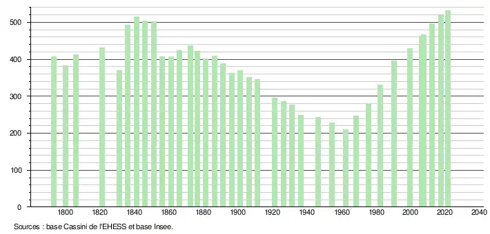 L'évolution du nombre d'habitants est connue à travers les recensements de la population effectués dans la commune depuis 1793. Pour les communes de moins de 10 000 habitants, une enquête de recensement portant sur toute la population est réalisée tous les cinq ans, les populations légales des années intermédiaires étant quant à elles estimées par interpolation ou extrapolation[20]. Pour la commune, le premier recensement exhaustif entrant dans le cadre du nouveau dispositif a été réalisé en 2007[21].