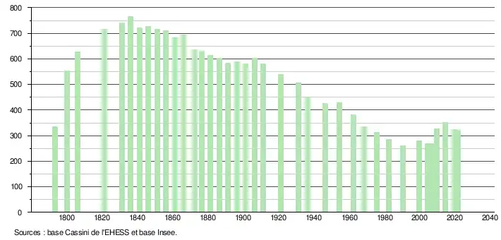 | L'évolution du nombre d'habitants est connue à travers les recensements de la population effectués dans la commune depuis 1793. Pour les communes de moins de 10 000 habitants, une enquête de recensement portant sur toute la population est réalisée tous les cinq ans, les populations légales des années intermédiaires étant quant à elles estimées par interpolation ou extrapolation[21]. Pour la commune, le premier recensement exhaustif entrant dans le cadre du nouveau dispositif a été réalisé en 2004[22]. En 2021, la commune comptait 322 habitants[Note 2], en diminution de 9,3 % par rapport à 2015 (Landes : +4,9 %, France hors Mayotte : +1,84 %). |