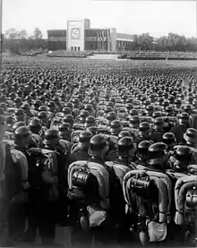 Le national-socialisme (en allemand Nationalsozialismus), plus couramment désigné en français sous l'abréviation nazisme (en allemand Nazismus), est l'idéologie politique du Parti national-socialiste des travailleurs allemands (NSDAP), parti politique d'extrême droite fondé en Allemagne en 1920 et dirigé par Adolf Hitler[1],[2],[3],[4]. Cette idéologie théorise une hiérarchie au sein de l'espèce humaine divisée en « races », au sommet desquelles se trouve la « race aryenne », supérieure, tandis que les races les plus détestées par les nazis, les Juifs, les Slaves et les Tziganes, forment la classe des « sous-hommes », les Untermenschen. Le nazisme est le seul type de fascisme incorporant à la fois racisme biologique et antisémitisme[5]. Par extension, le terme nazisme désigne le régime politique inspiré de cette idéologie, dictature totalitaire et expansionniste dirigée par Adolf Hitler de 1933 à 1945 et connue sous les noms de Troisième Reich ou d'Allemagne nazie.
