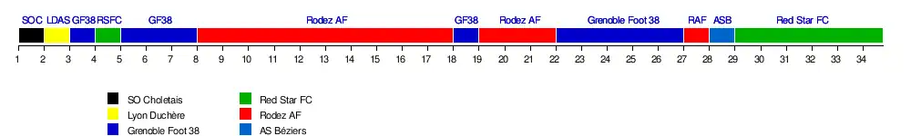 | Rodez | 10 | 11 | 7 | 9 | 5 | 2 | 2 | 1 | 1 | 1 | 1 | 1 | 1 | 1 | 1 | 1 | 1 | 3 | 1 | 1 | 1 | 2 | 2 | 2 | 2 | 2 | 1 | 3 | 4 | 3 | 4 | 4 | 4 | 4 | 24 | |