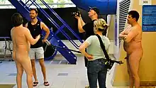 Enfin, le développement de la pratique est freinée par les politiques, adoptées par la plupart des centres[Lesquelles ?], qui en interdisent l'accès aux personnes seules et même, dans certains cas, aux couples de même sexe ou aux familles monoparentales. Cette forme de discrimination est interdite par les articles 10 et 15 de la Charte des droits et libertés de la personne[6], mais subsiste parce que les naturistes lésés n'osent pas porter plainte[réf. nécessaire]. Elle nuit aussi à la promotion, en ceci qu'elle contredit l'idéal d'égalité et de tolérance du naturisme et qu'elle complique la vie aux personnes, souvent seules, qui souhaitent faire une première expérience naturiste.[réf. nécessaire]