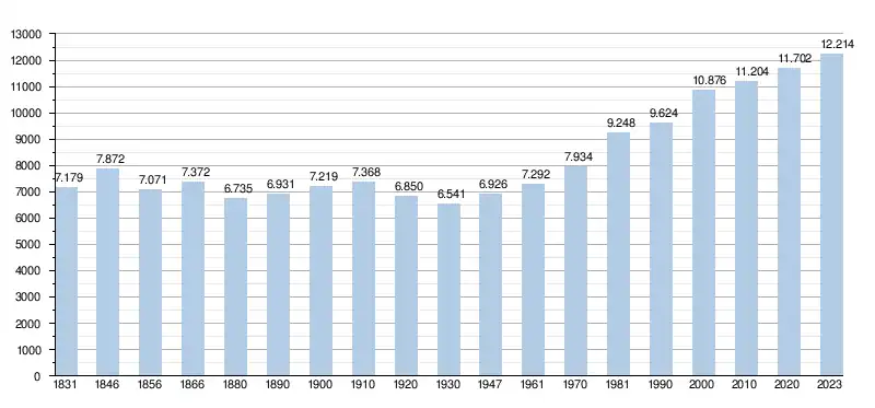Graphe de l'évolution de la population de la commune. Les données ci-après intègrent les anciennes communes dans les données avant la fusion en 1977.