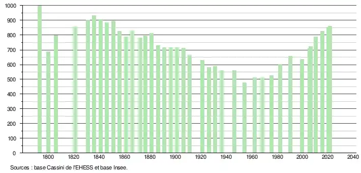 L'évolution du nombre d'habitants est connue à travers les recensements de la population effectués dans la commune depuis 1793. Pour les communes de moins de 10 000 habitants, une enquête de recensement portant sur toute la population est réalisée tous les cinq ans, les populations légales des années intermédiaires étant quant à elles estimées par interpolation ou extrapolation[27]. Pour la commune, le premier recensement exhaustif entrant dans le cadre du nouveau dispositif a été réalisé en 2005[28].