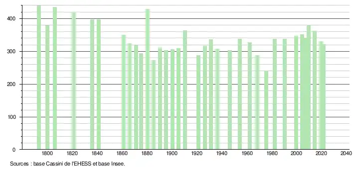 L'évolution du nombre d'habitants est connue à travers les recensements de la population effectués dans la commune depuis 1793. Pour les communes de moins de 10 000 habitants, une enquête de recensement portant sur toute la population est réalisée tous les cinq ans, les populations légales des années intermédiaires étant quant à elles estimées par interpolation ou extrapolation[26]. Pour la commune, le premier recensement exhaustif entrant dans le cadre du nouveau dispositif a été réalisé en 2004[27].