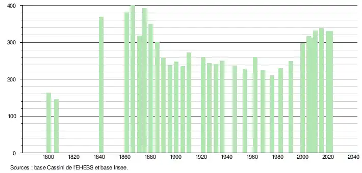 L'évolution du nombre d'habitants est connue à travers les recensements de la population effectués dans la commune depuis 1800. Pour les communes de moins de 10 000 habitants, une enquête de recensement portant sur toute la population est réalisée tous les cinq ans, les populations légales des années intermédiaires étant quant à elles estimées par interpolation ou extrapolation[18]. Pour la commune, le premier recensement exhaustif entrant dans le cadre du nouveau dispositif a été réalisé en 2004[19].