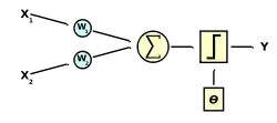 Le premier modèle mathématique et informatique du neurone biologique est proposé par Warren McCulloch et Walter Pitts en 1943[2]. En s'appuyant sur les propriétés des neurones biologiques connues à cette époque, issues d'observations neurophysiologiques et anatomiques, McCulloch et Pitts proposent un modèle simple de neurone formel. Il s'agit d'un neurone binaire, c'est-à-dire dont la sortie vaut 0 ou 1. Pour calculer cette sortie, le neurone effectue une somme pondérée de ses entrées (qui, en tant que sorties d'autres neurones formels, valent aussi 0 ou 1) puis applique une fonction d'activation à seuil : si la somme pondérée dépasse une certaine valeur, la sortie du neurone est 1, sinon elle vaut 0 (cf les sections suivantes).