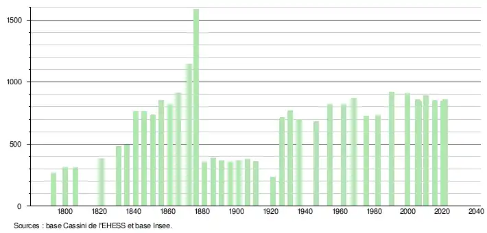 L'évolution du nombre d'habitants est connue à travers les recensements de la population effectués dans la commune depuis 1793. Pour les communes de moins de 10 000 habitants, une enquête de recensement portant sur toute la population est réalisée tous les cinq ans, les populations légales des années intermédiaires étant quant à elles estimées par interpolation ou extrapolation[27]. Pour la commune, le premier recensement exhaustif entrant dans le cadre du nouveau dispositif a été réalisé en 2005[28].