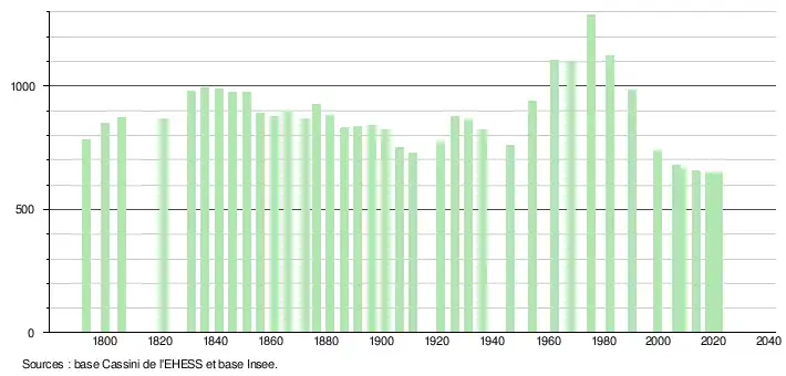 L'évolution du nombre d'habitants est connue à travers les recensements de la population effectués dans la commune depuis 1793. Pour les communes de moins de 10 000 habitants, une enquête de recensement portant sur toute la population est réalisée tous les cinq ans, les populations légales des années intermédiaires étant quant à elles estimées par interpolation ou extrapolation[45]. Pour la commune, le premier recensement exhaustif entrant dans le cadre du nouveau dispositif a été réalisé en 2008[46].