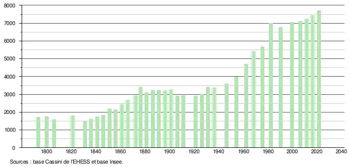 L'évolution du nombre d'habitants est connue à travers les recensements de la population effectués dans la commune depuis 1793. Pour les communes de moins de 10 000 habitants, une enquête de recensement portant sur toute la population est réalisée tous les cinq ans, les populations légales des années intermédiaires étant quant à elles estimées par interpolation ou extrapolation[30]. Pour la commune, le premier recensement exhaustif entrant dans le cadre du nouveau dispositif a été réalisé en 2006[31].