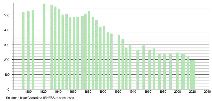 L'évolution du nombre d'habitants est connue à travers les recensements de la population effectués dans la commune depuis 1793. Pour les communes de moins de 10 000 habitants, une enquête de recensement portant sur toute la population est réalisée tous les cinq ans, les populations légales des années intermédiaires étant quant à elles estimées par interpolation ou extrapolation[14]. Pour la commune, le premier recensement exhaustif entrant dans le cadre du nouveau dispositif a été réalisé en 2008[15].