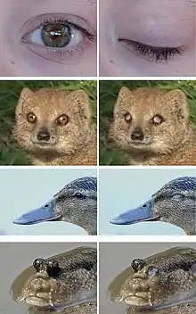 La nictation, ou clignement d'œil, est une fonction des yeux, qui clignent typiquement dans un délai entre 100 et 150 millisecondes du début à la fin. Si un œil s'assèche, baisser la paupière (ou une autre membrane) et la rouvrir rapidement peut aider à répartir l'humidité (larme) sur la surface de l'œil, rendant la situation moins inconfortable. Le clignement sert également à enlever les irritants qui auraient pu atterrir sur l’œil.
