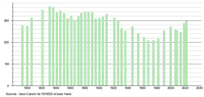L'évolution du nombre d'habitants est connue à travers les recensements de la population effectués dans la commune depuis 1793. Pour les communes de moins de 10 000 habitants, une enquête de recensement portant sur toute la population est réalisée tous les cinq ans, les populations légales des années intermédiaires étant quant à elles estimées par interpolation ou extrapolation[25]. Pour la commune, le premier recensement exhaustif entrant dans le cadre du nouveau dispositif a été réalisé en 2008[26].