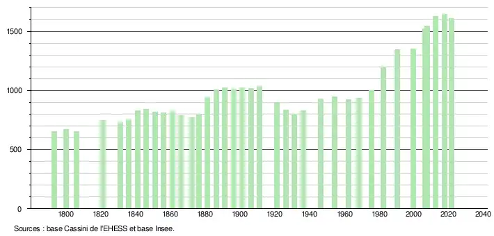 L'évolution du nombre d'habitants est connue à travers les recensements de la population effectués dans la commune depuis 1793. Pour les communes de moins de 10 000 habitants, une enquête de recensement portant sur toute la population est réalisée tous les cinq ans, les populations légales des années intermédiaires étant quant à elles estimées par interpolation ou extrapolation[22]. Pour la commune, le premier recensement exhaustif entrant dans le cadre du nouveau dispositif a été réalisé en 2007[23].