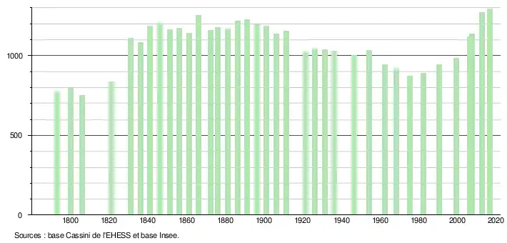 L'évolution du nombre d'habitants est connue à travers les recensements de la population effectués dans la commune depuis 1793. Pour les communes de moins de 10 000 habitants, une enquête de recensement portant sur toute la population est réalisée tous les cinq ans, les populations légales des années intermédiaires étant quant à elles estimées par interpolation ou extrapolation[8]. Pour la commune, le premier recensement exhaustif entrant dans le cadre du nouveau dispositif a été réalisé en 2007[9].