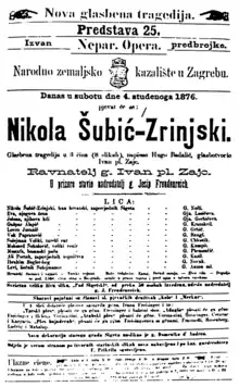 Nikola Šubić Zrinski est créé à Zagreb le sous la direction du compositeur, dans ce qui est encore alors le Théâtre du Peuple, installé dans l'actuel bâtiment de l'ancien hôtel de ville de Zagreb. L'opéra est accueilli positivement par le public lors de sa création[1]. Il rencontre alors un succès important dans la ville ainsi que dans le reste du pays et est repris rapidement après sa création.