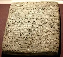 Le deuxième grand temple de Nimroud était celui de Nabû (nommé l'Ezida, le « temple pur » en sumérien), le dieu de la sagesse particulièrement vénéré en Assyrie[76]. Il était localisé au sud-est du tell, près du palais du gouverneur. C'est le sanctuaire le mieux connu par les fouilles, et il a fait récemment l'objet de travaux de restauration. On y pénétrait depuis une porte située au nord-est, gardée par des statues de pierre (à l'origine recouvertes de feuilles d'or selon un texte exhumé dans le Fort Salmanazar), qui représentaient des sages primordiaux appelés apkallu, des hommes à corps de poissons. De là on accédait aux deux cours principales du temple, disposées sur son côté est. La seconde, au sud, ouvrait sur son côté sud sur deux vestibules conduisant à deux cellae jumelles dédiées à Nabû et à sa parèdre Tashmetu. La partie nord-ouest de l'édifice comprenait une cour secondaire ouvrant sur une sorte de salle du trône, ainsi que deux pièces qui semblent être des répliques des deux cellae. Celles-ci devaient servir pour des rituels majeurs, sans doute la fête akitu qui apparaît dans plusieurs tablettes relatives à ce sanctuaire et qui se conclut par un rituel de mariage sacré du couple divin. Plusieurs objets en ivoire et de nombreuses tablettes furent mis au jour dans le temple de Nabû. L'une des salles qui jouxte la grande cour sud est une véritable bibliothèque, contenant environ 300 tablettes datées du VIIe siècle av. J.-C. Celles-ci servaient aux prêtres exorcistes (āšipu) du temple, en majorité des textes d'exorcisme ou de divination, mais aussi des listes lexicales et des hymnes caractéristiques de la culture des lettrés assyriens[77]. La « salle du trône » du nord-ouest livra quant à elle plusieurs tablettes contenant des traités politiques (adê) passés entre Assarhaddon et des chefs mèdes. Les dieux étant les garants de ce type de serment, il était courant d'en conserver des copies dans les temples[78]. L'activité du sanctuaire est également documentée par des lettres adressées par ses responsables au roi Assarhaddon, mises au jour à Ninive, devenue capitale de l'empire, qui documentent son activité cultuelle, notamment la fête majeure du mariage sacré (hiérogamie) entre Nabû et Tashmetu[79]. Quelques tablettes du VIIe siècle av. J.-C. documentent enfin la vie économique du sanctuaire : deux tablettes enregistrant la réception de dons d'esclaves et de terres, et quelques notes de dettes concernant des prêts en grain[80].