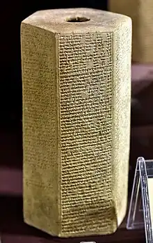 « La vieille cité de Kalkhu que Salmanazar, roi d'Assyrie, un prince qui me précéda, avait construite - cette cité était en ruines, restait en sommeil. Je reconstruisis cette ville. Je pris les peuples que j'avais conquis, depuis les pays que j'avais dominés, du pays de Suhu, du pays de Laqe dans sa totalité, de la ville de Sirqu qui est sur le gué de l'Euphrate, du pays de Zamua, du Bit-Adini et du pays du Hatti, et de Lubarna et du Patinu. Je les installai au cœur (de la ville). »