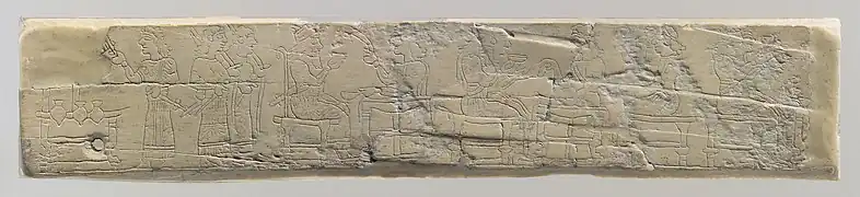 Le chantier de construction s'acheva par une fête au cours de laquelle les dieux de l'Assyrie, le grand dieu national Assur en tête, furent conviés à venir admirer et bénir la réalisation d'Assurnasirpal II. La Stèle du banquet comprend une longue liste de tous les animaux, céréales, fruits, légumes et boissons qui furent servis aux convives : ainsi 100 bœufs gras, 500 oies, 10 000 pigeons, 10 000 œufs, autant de galettes de pain, 100 jarres de bière de qualité, autant de miel, de lait, de moutarde et de fromage, des dattes, des pistaches, des épices et divers condiments, etc.[34]. Le texte conclut en énumérant les sujets du souverain qui furent « invités » à admirer sa nouvelle capitale et au banquet en son honneur :