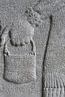 Le chantier de construction de Kalkhu, qui fut une véritable refondation de la ville, est célébré dans plusieurs inscriptions royales d'Assurnasirpal II retrouvées dans les édifices principaux de la ville. C'est en particulier le cas de l'« Inscription standard », un texte court (une vingtaine de lignes) commémorant les conquêtes du souverain et la construction de la nouvelle capitale. Elle doit son nom au fait qu'elle fut reproduite sans grande variation des dizaines de fois sur les bas-reliefs du Palais nord-ouest d'Assurnasirpal II, en position centrale. D'autres inscriptions du souverain reprennent par ailleurs en partie ce texte[26]. Un autre texte primordial pour connaître la construction de Kalkhu est la « Stèle du banquet », texte nettement plus long débutant par une version abrégée du précédent puis développant la description de la construction des palais et temples de la ville, les différentes essences d'arbres implantées dans les jardins de la ville, et enfin le formidable banquet que le monarque donna pour célébrer la fin de la construction, passage final auquel le texte doit son nom moderne[27]. Ces textes présentent une vision idéalisée de la construction de la ville, mettant en valeur la personne du roi, sa puissance et sa capacité à maîtriser les ressources de son royaume et à y assurer l'ordre du monde suivant les volontés des grands dieux qui lui ont confié ses destinées en assurant ses triomphes militaires, afin de réaliser une ville grandiose et des monuments sans égal. Cette entreprise créatrice fait écho à celle des divinités dans les mythes de création[28]. Ces récits servirent de modèle aux récits de construction des rois assyriens suivants, en particulier ceux relatant la construction des capitales suivantes (Dur-Sharrukin par Sargon II et surtout Ninive par Sennacherib)[29].
