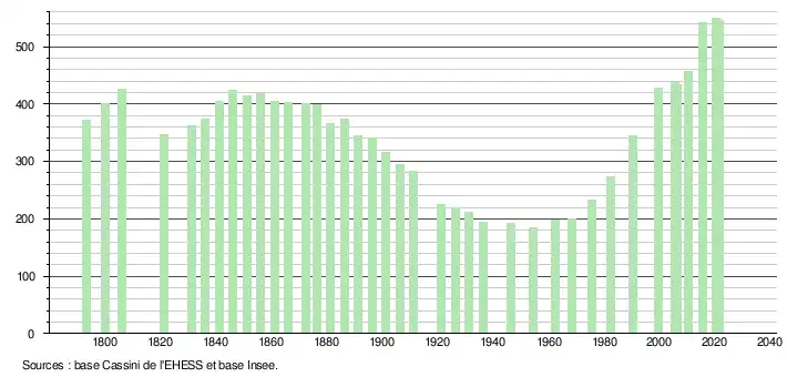 L'évolution du nombre d'habitants est connue à travers les recensements de la population effectués dans la commune depuis 1793. Pour les communes de moins de 10 000 habitants, une enquête de recensement portant sur toute la population est réalisée tous les cinq ans, les populations légales des années intermédiaires étant quant à elles estimées par interpolation ou extrapolation[15]. Pour la commune, le premier recensement exhaustif entrant dans le cadre du nouveau dispositif a été réalisé en 2005[16].