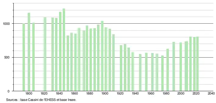 L'évolution du nombre d'habitants est connue à travers les recensements de la population effectués dans la commune depuis 1793. Pour les communes de moins de 10 000 habitants, une enquête de recensement portant sur toute la population est réalisée tous les cinq ans, les populations légales des années intermédiaires étant quant à elles estimées par interpolation ou extrapolation[17]. Pour la commune, le premier recensement exhaustif entrant dans le cadre du nouveau dispositif a été réalisé en 2007[18].