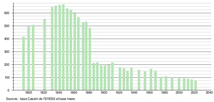 L'évolution du nombre d'habitants est connue à travers les recensements de la population effectués dans la commune depuis 1793. Pour les communes de moins de 10 000 habitants, une enquête de recensement portant sur toute la population est réalisée tous les cinq ans, les populations légales des années intermédiaires étant quant à elles estimées par interpolation ou extrapolation[21]. Pour la commune, le premier recensement exhaustif entrant dans le cadre du nouveau dispositif a été réalisé en 2006[22].