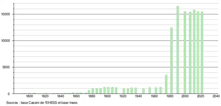 - Par convention dans Wikipédia, le principe a été retenu de n’afficher dans le tableau des recensements et le graphique, pour les populations légales postérieures à 1999, que les populations correspondant à une enquête exhaustive de recensement pour les communes de moins de 10 000 habitants, et que les populations des années 2006, 2011, 2016, etc. pour les communes de plus de 10 000 habitants, ainsi que la dernière population légale publiée par l’Insee pour l'ensemble des communes.