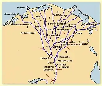 | 16 | Nome du Dauphin | Ḥat Meḥit (ḥȝt-mḥjt) | Djedet (Ḏdt) | Mendès (Μένδης) | Tell el-Rub'a (تل الربع) |