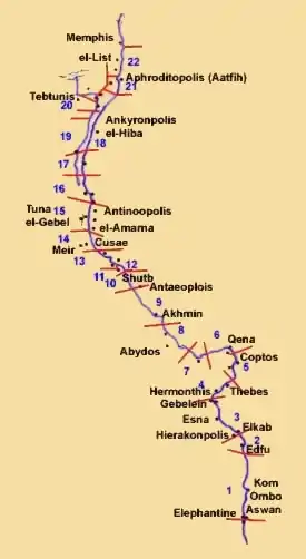 | 5 | Nome des Deux Divinités | Netjerouy (nṯrwj) | Gebtou (Gbtyw) | Coptos (Κόπτος) | Qift (قفط) |
