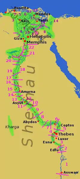 | 21 | Nome inférieur du Laurier rose | Nârt Peḥet (nˁrt pḥt) | Semenouhor (Smnḥr) puis Shedyt (Šdt) | Akanthon (Ακανθον) puis Crocodilopolis (Κροκοδείλων πόλις) | Kafr Ammar puis Médinet el-Fayoum (الفيو) |