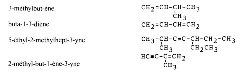 | Insaturation | >C=C< (alcènes) | -ène (se substitue au -ane de l'hydrocarbure saturé) |