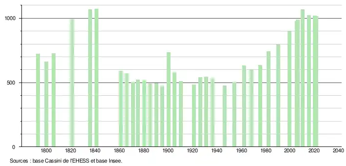 L'évolution du nombre d'habitants est connue à travers les recensements de la population effectués dans la commune depuis 1793. Pour les communes de moins de 10 000 habitants, une enquête de recensement portant sur toute la population est réalisée tous les cinq ans, les populations légales des années intermédiaires étant quant à elles estimées par interpolation ou extrapolation[23]. Pour la commune, le premier recensement exhaustif entrant dans le cadre du nouveau dispositif a été réalisé en 2005[24].