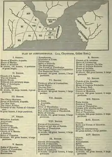 - Région I : le Grand Palais de Constantinople, palais de Lausos, palais Placidia, les bains Arcadianas et quinze bains privés, cent-dix-huit « domus » .