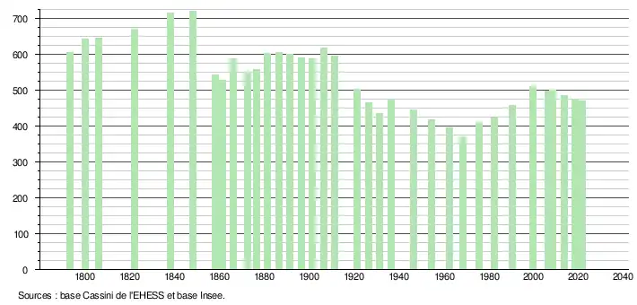 L'évolution du nombre d'habitants est connue à travers les recensements de la population effectués dans la commune depuis 1793. Pour les communes de moins de 10 000 habitants, une enquête de recensement portant sur toute la population est réalisée tous les cinq ans, les populations légales des années intermédiaires étant quant à elles estimées par interpolation ou extrapolation[16]. Pour la commune, le premier recensement exhaustif entrant dans le cadre du nouveau dispositif a été réalisé en 2008[17].