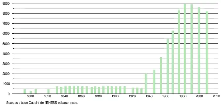L'évolution du nombre d'habitants est connue à travers les recensements de la population effectués dans la commune depuis 1793. À partir du , les populations légales des communes sont publiées annuellement dans le cadre d'un recensement qui repose désormais sur une collecte d'information annuelle, concernant successivement tous les territoires communaux au cours d'une période de cinq ans. Pour les communes de moins de 10 000 habitants, une enquête de recensement portant sur toute la population est réalisée tous les cinq ans, les populations légales des années intermédiaires étant quant à elles estimées par interpolation ou extrapolation[20]. Pour la commune, le premier recensement exhaustif entrant dans le cadre du nouveau dispositif a été réalisé en 2008[21],[Note 2].