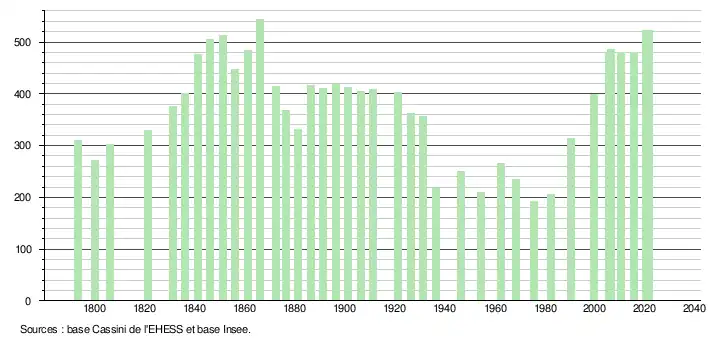 L'évolution du nombre d'habitants est connue à travers les recensements de la population effectués dans la commune depuis 1793. Pour les communes de moins de 10 000 habitants, une enquête de recensement portant sur toute la population est réalisée tous les cinq ans, les populations légales des années intermédiaires étant quant à elles estimées par interpolation ou extrapolation[31]. Pour la commune, le premier recensement exhaustif entrant dans le cadre du nouveau dispositif a été réalisé en 2005[32].