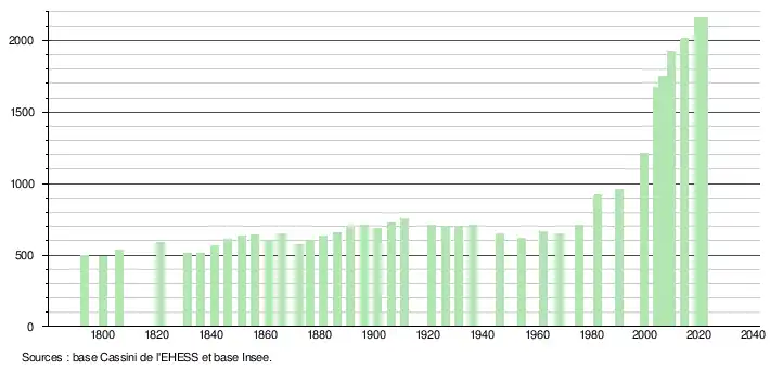 L'évolution du nombre d'habitants est connue à travers les recensements de la population effectués dans la commune depuis 1793. Pour les communes de moins de 10 000 habitants, une enquête de recensement portant sur toute la population est réalisée tous les cinq ans, les populations légales des années intermédiaires étant quant à elles estimées par interpolation ou extrapolation[25]. Pour la commune, le premier recensement exhaustif entrant dans le cadre du nouveau dispositif a été réalisé en 2004[26].