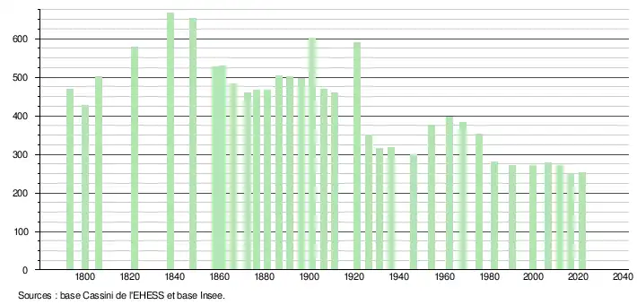 L'évolution du nombre d'habitants est connue à travers les recensements de la population effectués dans la commune depuis 1793. Pour les communes de moins de 10 000 habitants, une enquête de recensement portant sur toute la population est réalisée tous les cinq ans, les populations légales des années intermédiaires étant quant à elles estimées par interpolation ou extrapolation[15]. Pour la commune, le premier recensement exhaustif entrant dans le cadre du nouveau dispositif a été réalisé en 2006[16].