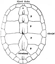 La croissance particulière des côtes est causée pas les primordium des crêtes carapaciales, des structures au niveau tissulaire spécifique aux tortues[13]. Ces crêtes seraient dérivées des crêtes wolfiennes des amniotes, impliquées notamment dans la formation du système urogénital et dans le développement des membres. Communément appelées CR, les crêtes carapaciales sont à la limite entre le plan axial et le plan latéral du corps de la tortue. Ce sont elles qui influencent la croissance des côtes selon un modèle en plaques, qui donne naissance à la carapace.
