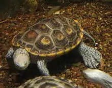 La carapace des tortues provient de l'acquisition de l'ostéoderme par les chéloniens. C'est l'élargissement des côtes et des vertèbres, liés à l'ostéoderme, qui forme cette structure. Une des hypothèses les plus probables soutient qu'un phénomène d'hétérotopie pourrait être à la base de la formation de la carapace[15]. Le développement osseux aurait changé de région, ce qui aurait modifié la nature des interactions «entre le derme et le primordium des côtes, menant à une ossification dermale ectopique»[13].