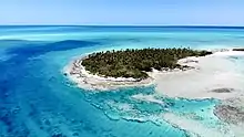 - les récifs d'Entrecasteaux, à 223 km de la pointe nord-ouest de la Grande Terre, dans le prolongement des îles Belep desquelles ils sont séparés par le « Grand Passage », détroit de 500 à 600 mètres de fond. Il comprend les atolls de Huon et de la Surprise (les deux plus importants, avec les îles Fabre et Le Leizour[67]), Pelotas et du Portail[68], ainsi que les récifs Guilbert et du Mérite[69]. Ils constituent la limite nord du lagon de la Nouvelle-Calédonie.
