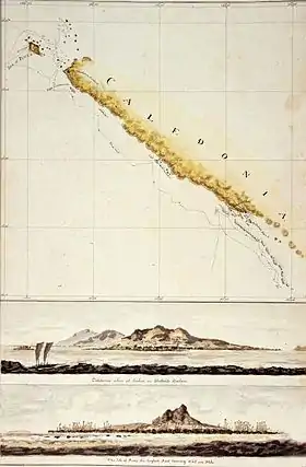 Le , l'enseigne de vaisseau James Colnett aperçoit à l'horizon une terre inconnue des Européens. Il se trouve à bord du bâtiment commandé par le navigateur et explorateur anglais James Cook, le HMS Resolution, durant son deuxième voyage. Cook baptise cette terre New Caledonia en l'honneur de l'Écosse. En effet, l'aspect des côtes lui aurait rappelé cette région de Grande-Bretagne, dont le père de Cook est originaire (Caledonia est l'ancien nom latin de la province correspondant à l'Écosse britannique). Le premier contact avec des Kanaks a lieu le lendemain, à Balade au nord-est de la Grande Terre, puis l'expédition britannique longe la côte Est et arrive jusqu'à l'île des Pins le [8].