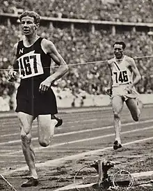 Jack Lovelock remportant le 1500 m devant l'Américain Glenn Cunningham.