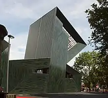 Le concept ambitieux et moderniste de l'architecte Manuel Herz pour cette synagogue forme le mot Kedouscha. La façade de l'immeuble est ornée de céramique verte.