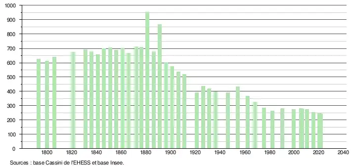 L'évolution du nombre d'habitants est connue à travers les recensements de la population effectués dans la commune depuis 1793. Pour les communes de moins de 10 000 habitants, une enquête de recensement portant sur toute la population est réalisée tous les cinq ans, les populations légales des années intermédiaires étant quant à elles estimées par interpolation ou extrapolation[23]. Pour la commune, le premier recensement exhaustif entrant dans le cadre du nouveau dispositif a été réalisé en 2005[24].