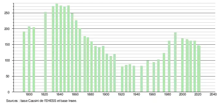L'évolution du nombre d'habitants est connue à travers les recensements de la population effectués dans la commune depuis 1793. Pour les communes de moins de 10 000 habitants, une enquête de recensement portant sur toute la population est réalisée tous les cinq ans, les populations légales des années intermédiaires étant quant à elles estimées par interpolation ou extrapolation[24]. Pour la commune, le premier recensement exhaustif entrant dans le cadre du nouveau dispositif a été réalisé en 2005[25].