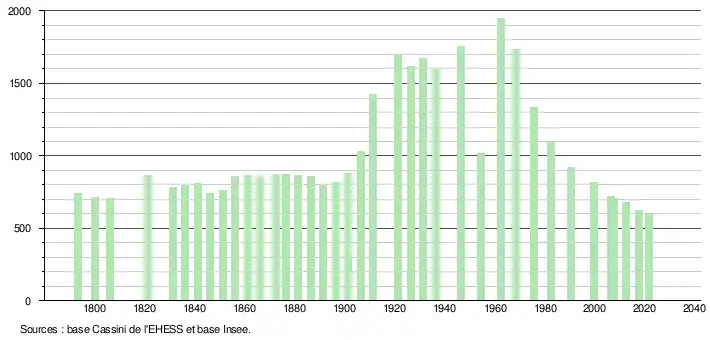 L'évolution du nombre d'habitants est connue à travers les recensements de la population effectués dans la commune depuis 1793. Pour les communes de moins de 10 000 habitants, une enquête de recensement portant sur toute la population est réalisée tous les cinq ans, les populations légales des années intermédiaires étant quant à elles estimées par interpolation ou extrapolation[26]. Pour la commune, le premier recensement exhaustif entrant dans le cadre du nouveau dispositif a été réalisé en 2007[27].