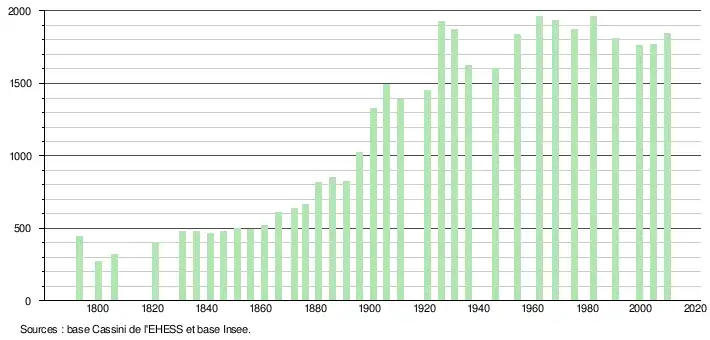 L'évolution du nombre d'habitants est connue à travers les recensements de la population effectués dans la commune depuis 1793. À partir du , les populations légales des communes sont publiées annuellement dans le cadre d'un recensement qui repose désormais sur une collecte d'information annuelle, concernant successivement tous les territoires communaux au cours d'une période de cinq ans. Pour les communes de moins de 10 000 habitants, une enquête de recensement portant sur toute la population est réalisée tous les cinq ans, les populations légales des années intermédiaires étant quant à elles estimées par interpolation ou extrapolation[25]. Pour la commune, le premier recensement exhaustif entrant dans le cadre du nouveau dispositif a été réalisé en 2004[26],[Note 1].
