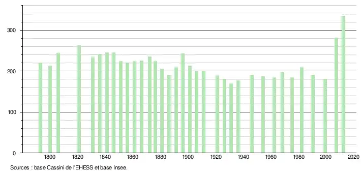 L'évolution du nombre d'habitants est connue à travers les recensements de la population effectués dans la commune depuis 1793. À partir du , les populations légales des communes sont publiées annuellement dans le cadre d'un recensement qui repose désormais sur une collecte d'information annuelle, concernant successivement tous les territoires communaux au cours d'une période de cinq ans. Pour les communes de moins de 10 000 habitants, une enquête de recensement portant sur toute la population est réalisée tous les cinq ans, les populations légales des années intermédiaires étant quant à elles estimées par interpolation ou extrapolation[10]. Pour la commune, le premier recensement exhaustif entrant dans le cadre du nouveau dispositif a été réalisé en 2007[11],[Note 1].