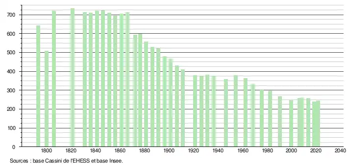 L'évolution du nombre d'habitants est connue à travers les recensements de la population effectués dans la commune depuis 1793. Pour les communes de moins de 10 000 habitants, une enquête de recensement portant sur toute la population est réalisée tous les cinq ans, les populations légales des années intermédiaires étant quant à elles estimées par interpolation ou extrapolation[20]. Pour la commune, le premier recensement exhaustif entrant dans le cadre du nouveau dispositif a été réalisé en 2008[21].